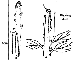 1. Vết xẻ đôi ở gốc ghép dài khoảng 4cm; 2. Nêm dài khoảng 4cm; 3. Đinh tre để cố định
