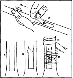 3) Cẩn thận lấy miếng vỏ cây có mắt ghép, cầm 2 bên mảnh vỏ cho khỏi bẩn, nhanh chóng đưa mảnh vỏ có mắt ghép nhét vào cửa sổ ỏ" góc ghép, sao cho mắt ghép hưổng về phía trên để khi nhú mầm ra cành hướng lên trên.