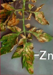 - Thiếu chất kẽm (Zn): Lá non ở các cây thiếu kẽm có phần bìa và gân màu xanh trong khi phần phiến lá giữa các gân thì chuyển vàng. Ít phân cành, rẽ nhánh và gần như các cành không phát triển, số lượng quả ít và có chất lượng kém.
