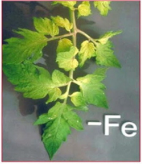 - Thiếu chất sắt (Fe): Lá ở các cây trồng thiếu sắt sẽ chuyển sang màu xanh nhạt, các gân lá vẫn giữ màu đậm với phần thịt giữa các gân úa vàng. Có thể thấy rất rõ sự tách biệt màu sắc giữa các bộ phận trên lá. Nếu tình trạng thiếu sắt nghiêm trọng, toàn bộ lá chuyển sang màu vàng hoặc trắng.